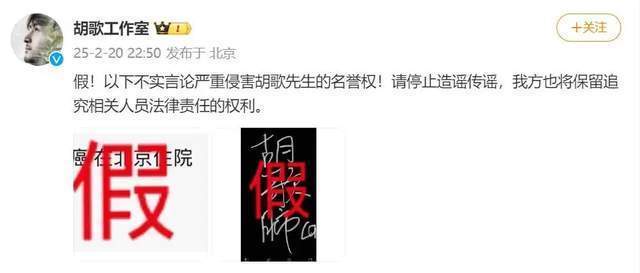 对此,胡歌工作室发布声明辟谣:假!以下不实言论严重侵害胡歌先生的名誉权!请停止造谣传谣,我方也将保留追究相关人员法律责任的权利。